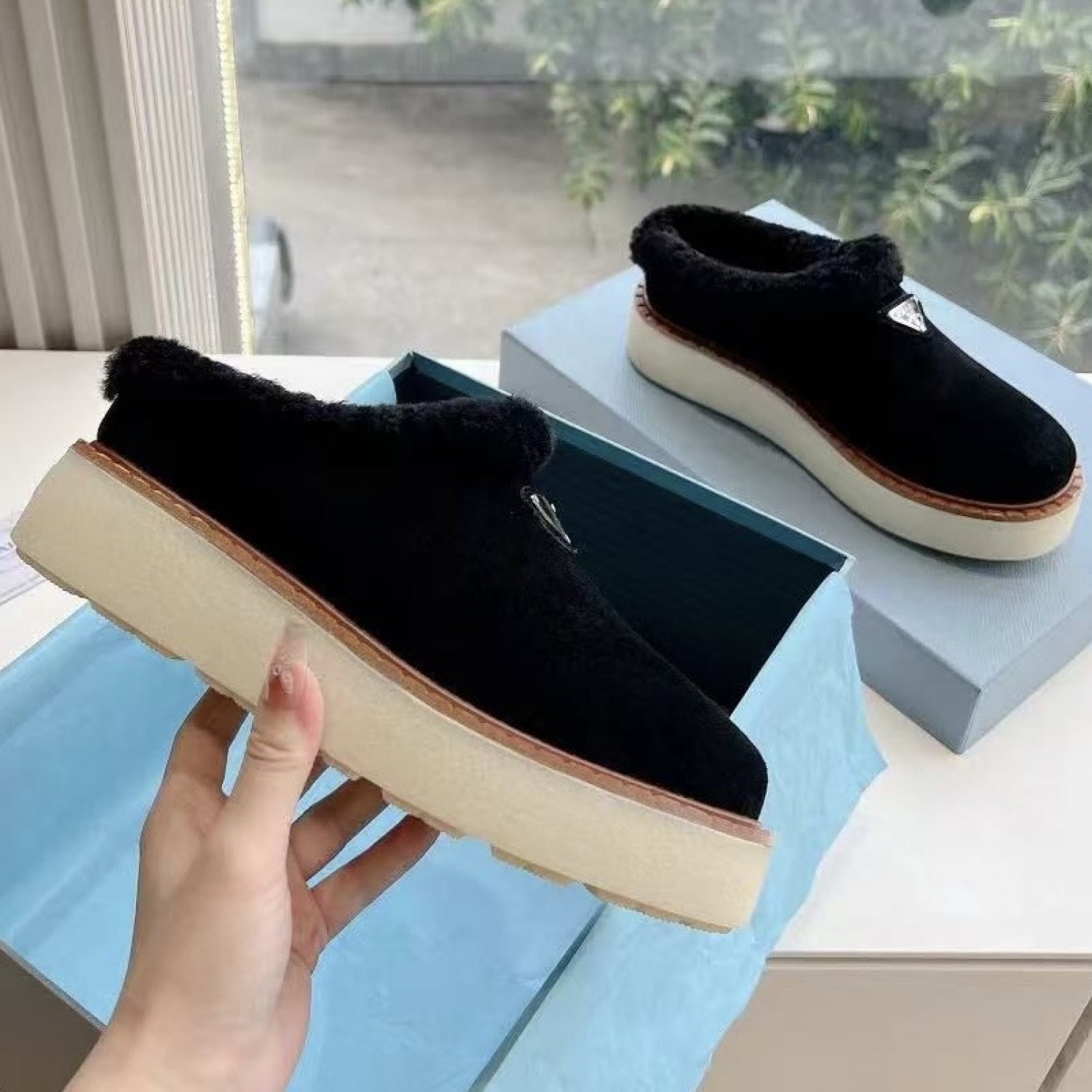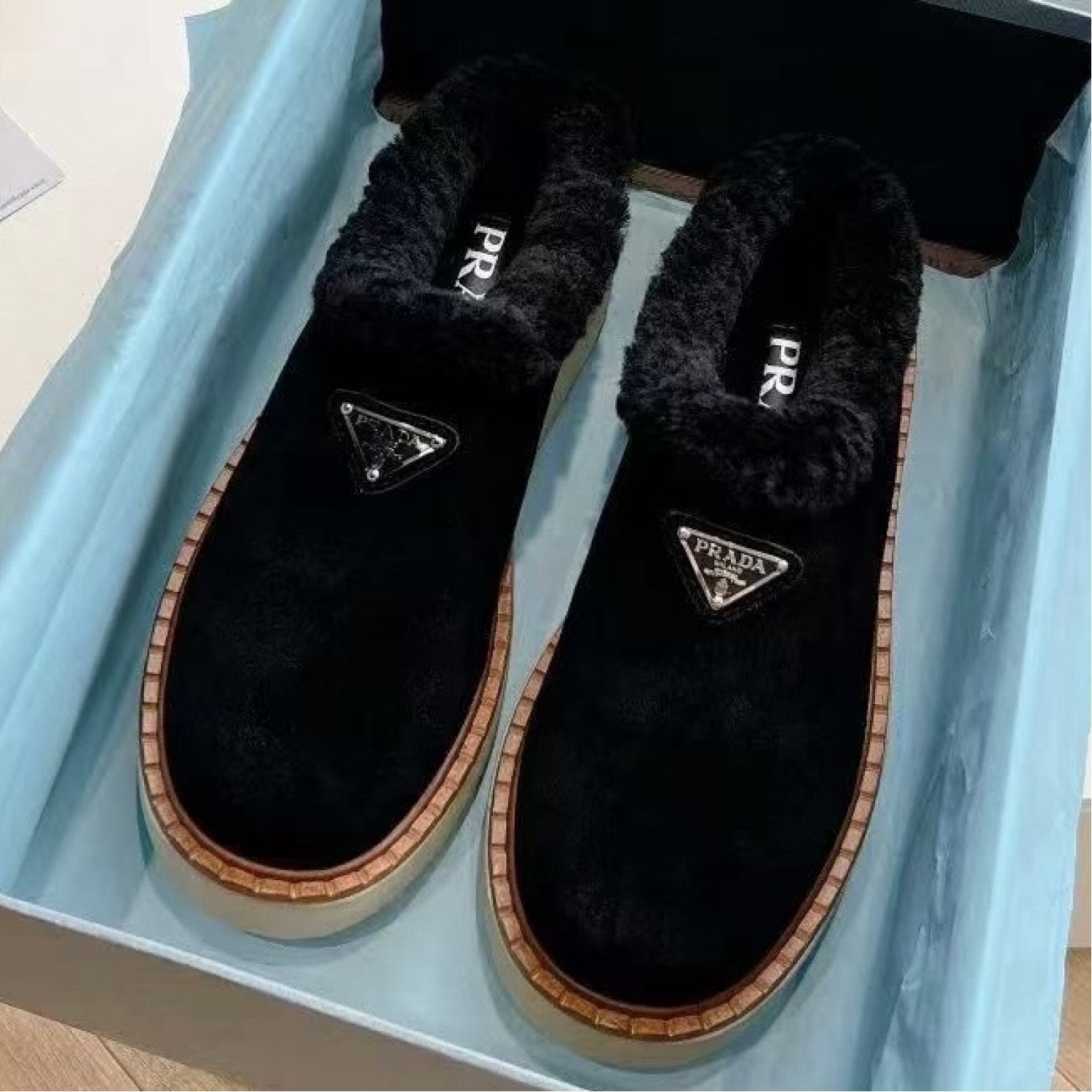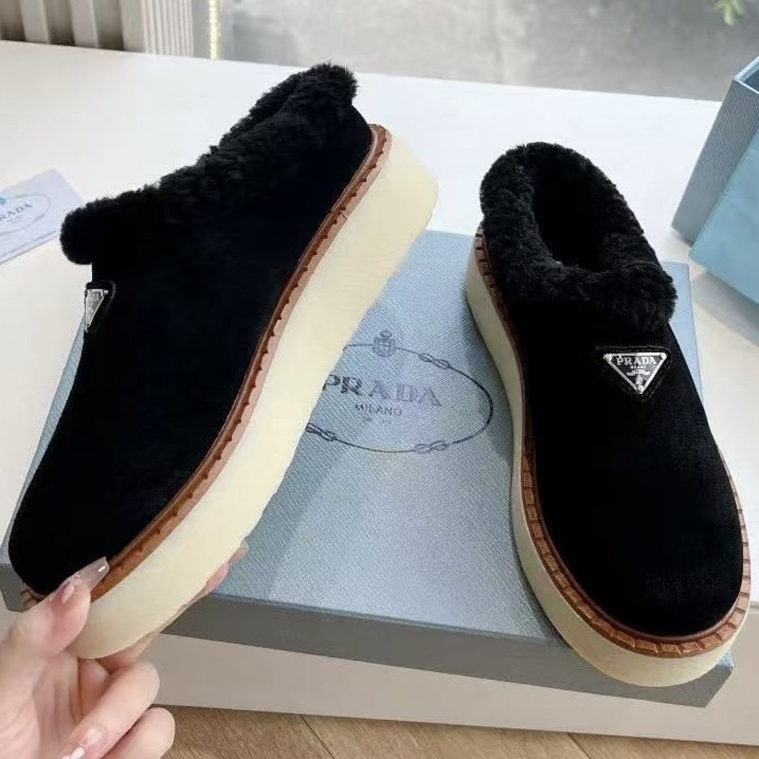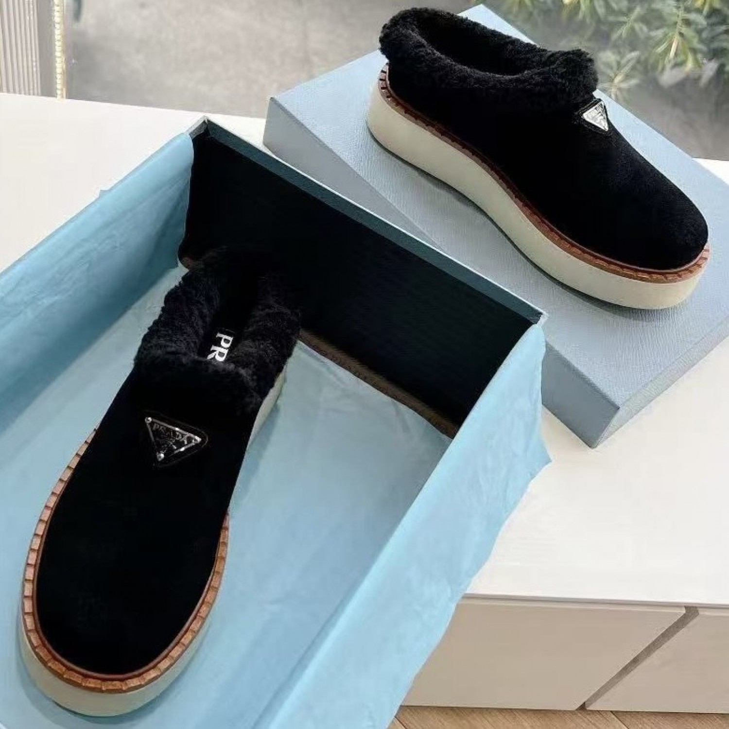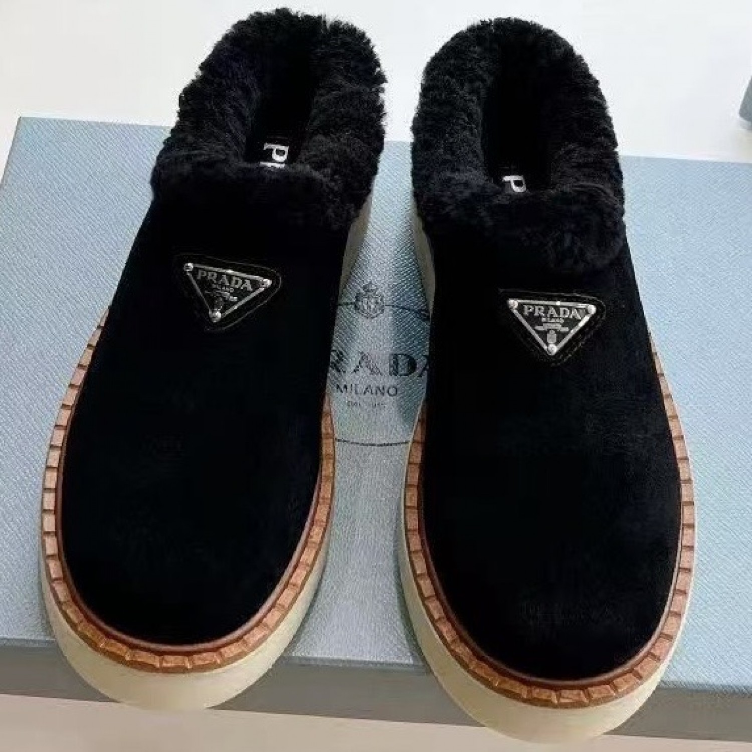 Зимние лоферы Prada с пушистым воротником