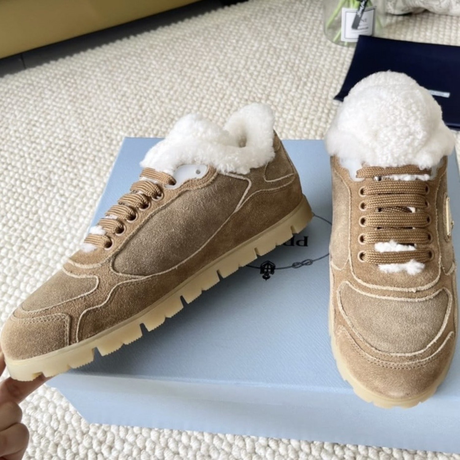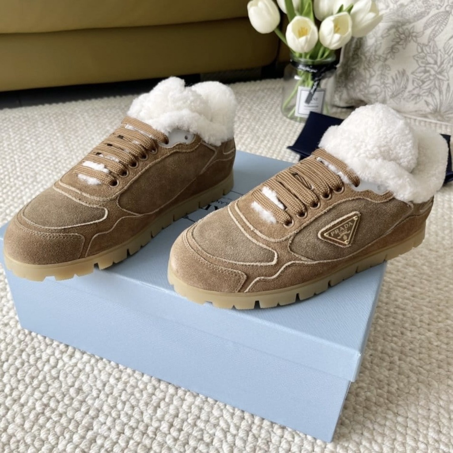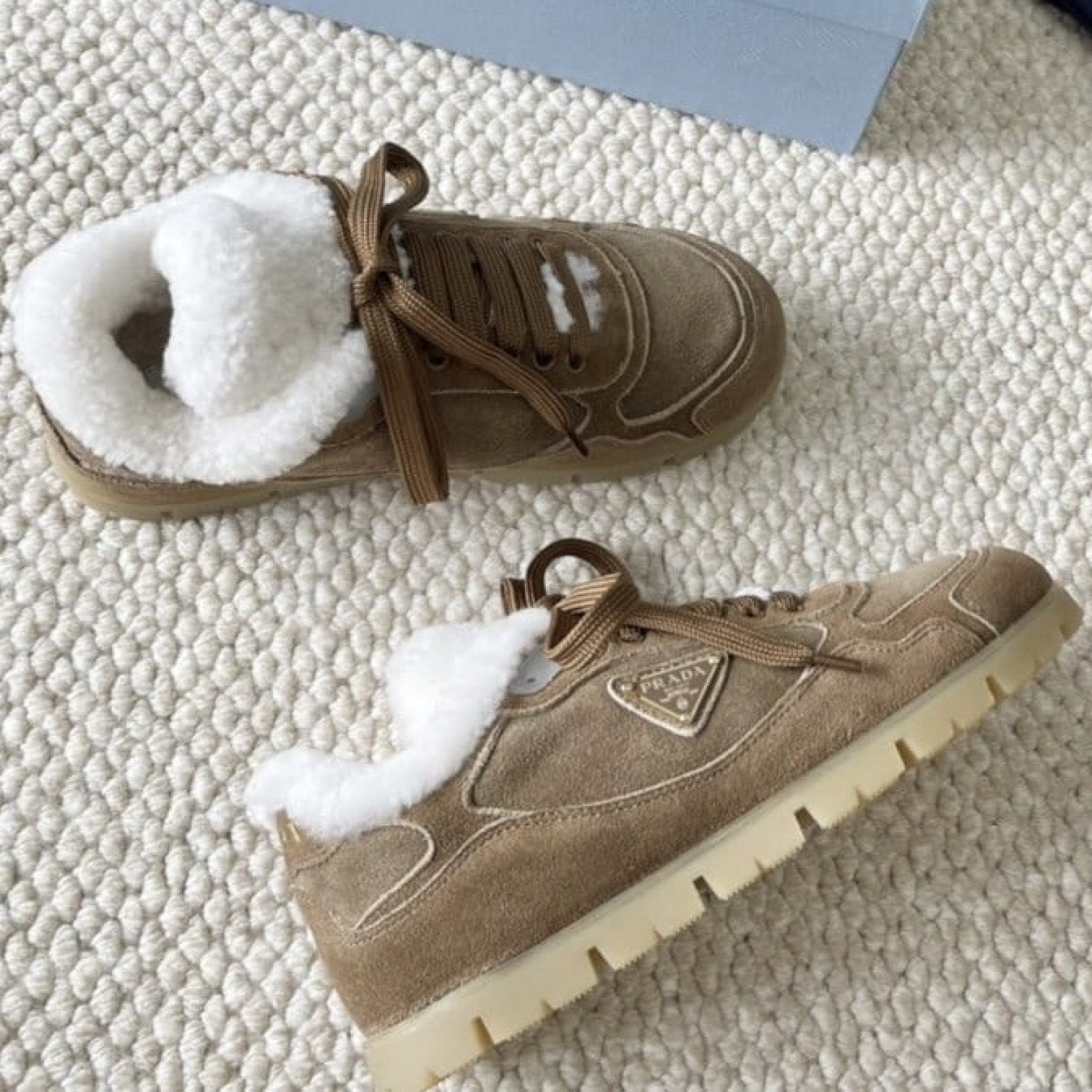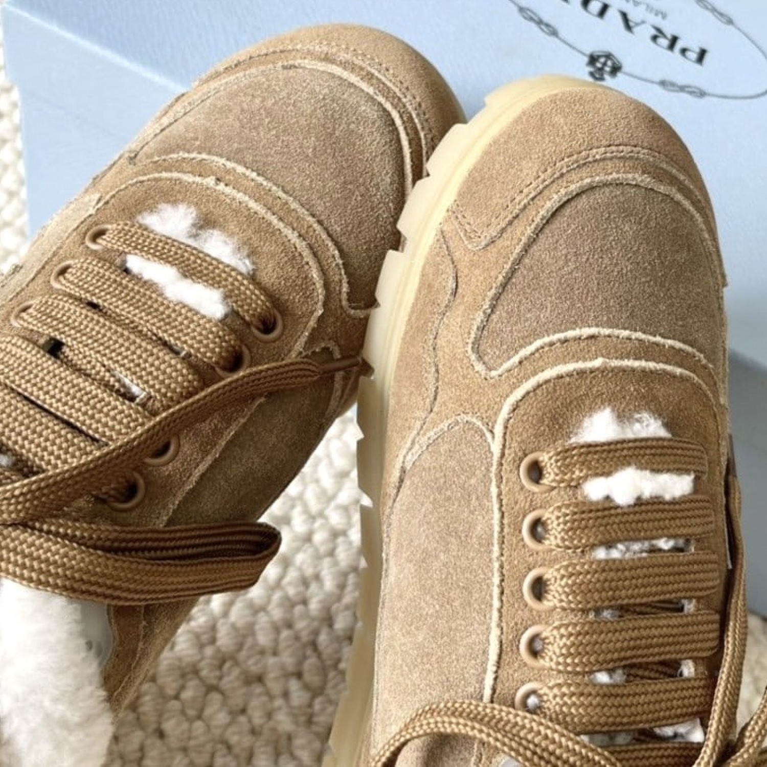 Зимние замшевые кеды Prada с мехом