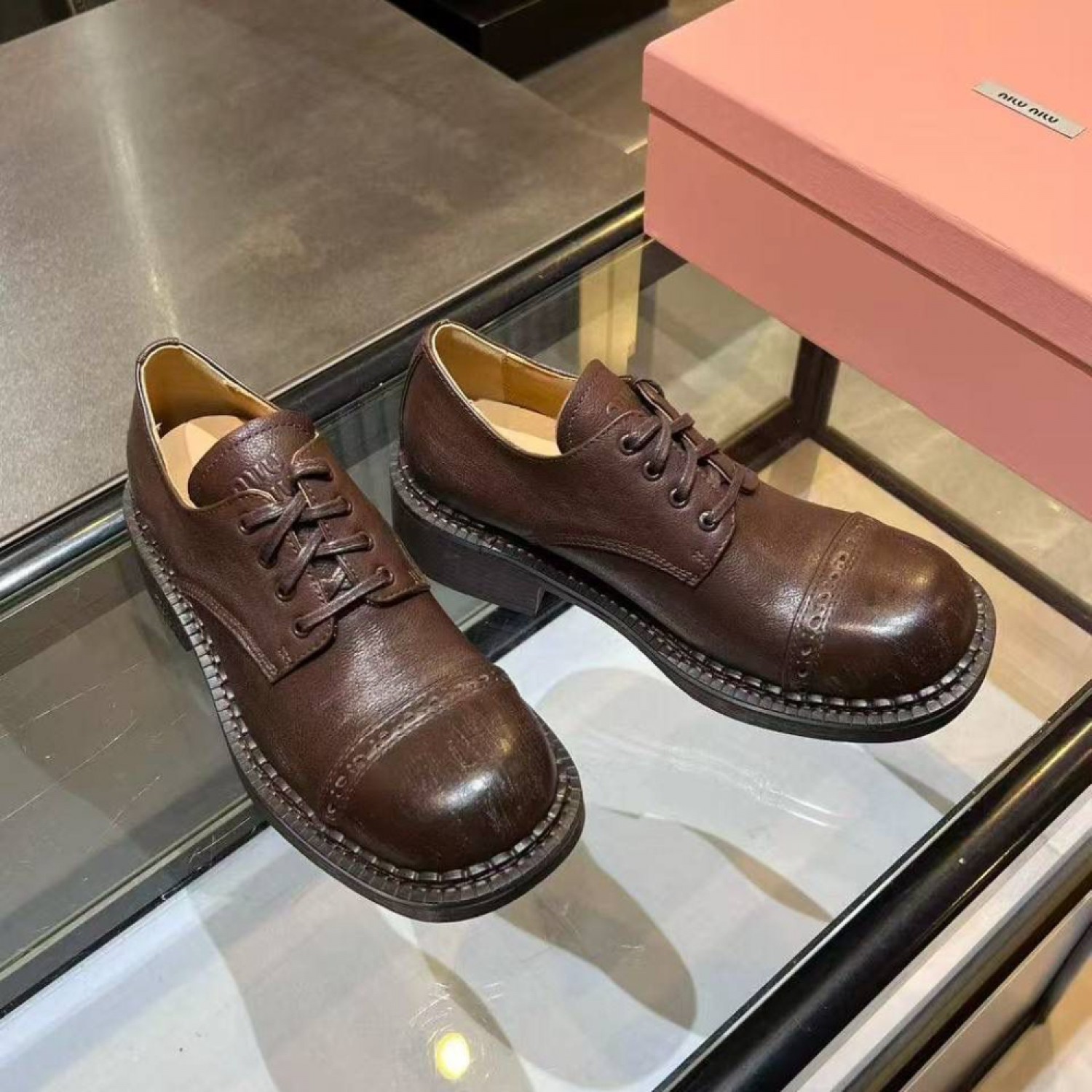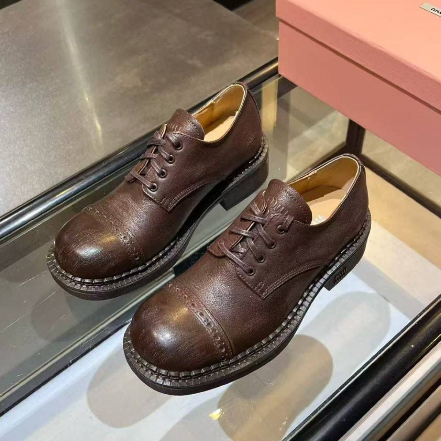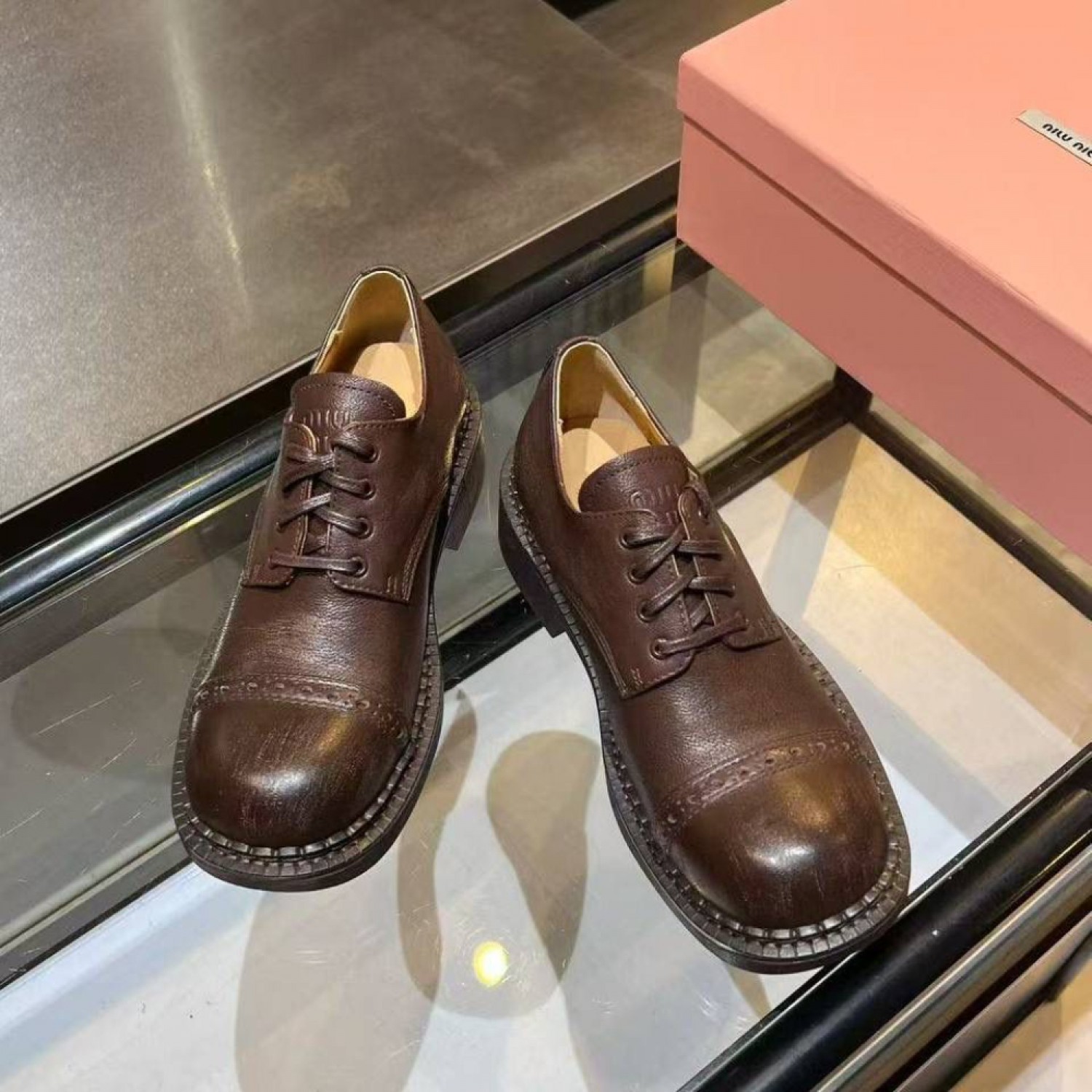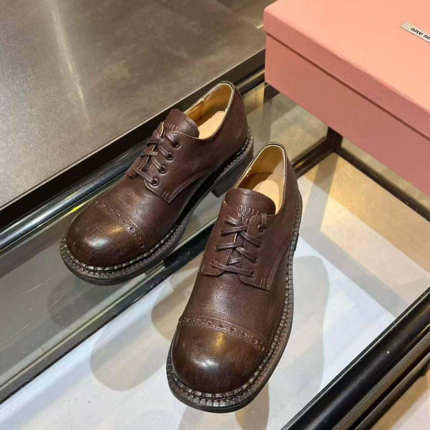 - В этих кожаных туфлях на шнуровке сочетаются формальность и непринужденность. Верх отсылает к классической обуви, а шнурки — к кроссовкам. Логотип Miu Miu на язычке придает этому образу особую изюминку.