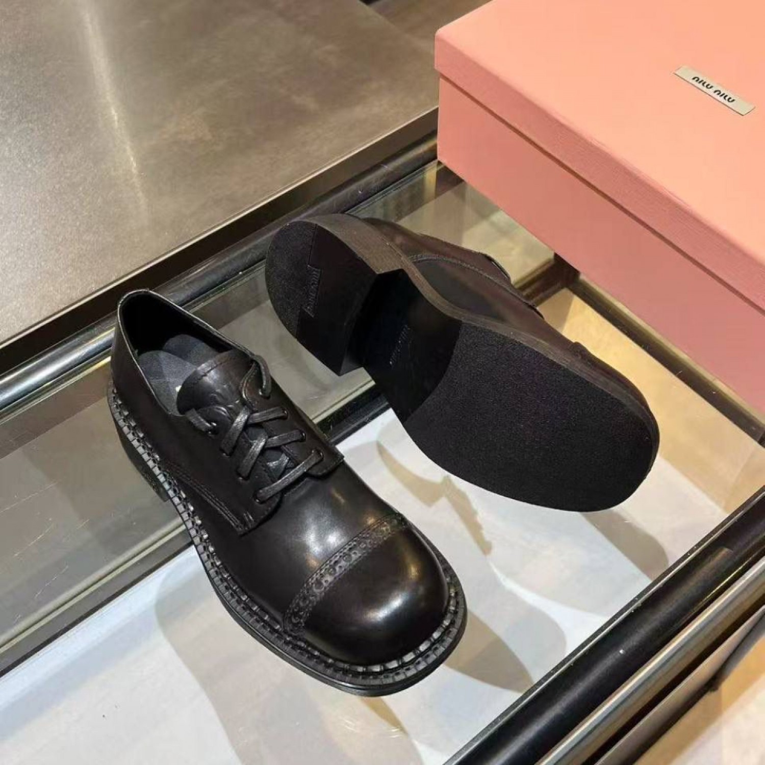 - В этих кожаных туфлях на шнуровке сочетаются формальность и непринужденность. Верх отсылает к классической обуви, а шнурки — к кроссовкам. Логотип Miu Miu на язычке придает этому образу особую изюминку.