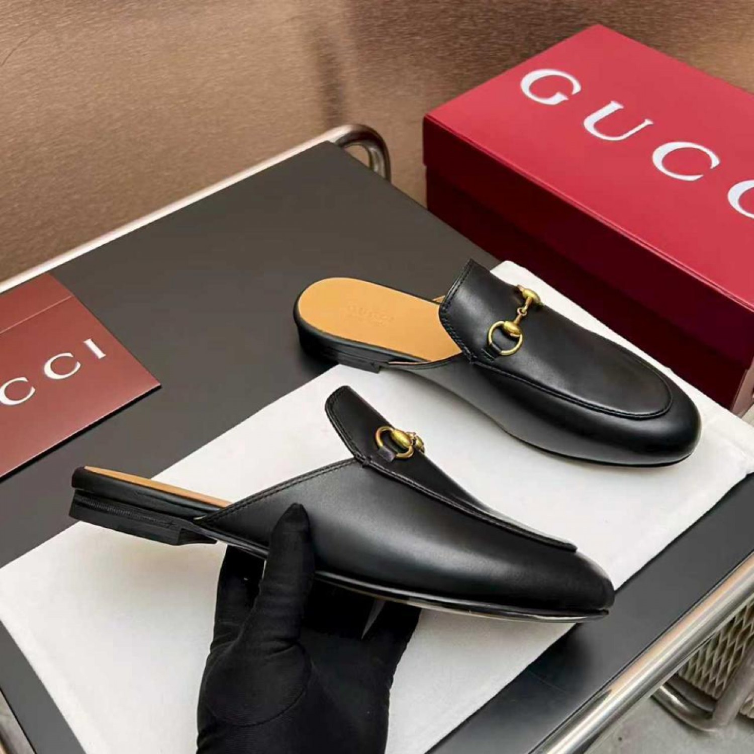 - Модель Princetown, ставшая визитной карточкой Gucci с момента своего дебюта на показе осень-зима 2015, представлена в кожаном исполнении. Модель в стиле мюли украшена характерным золотистым символом Horsebit, вдохновленным миром конного спорта.