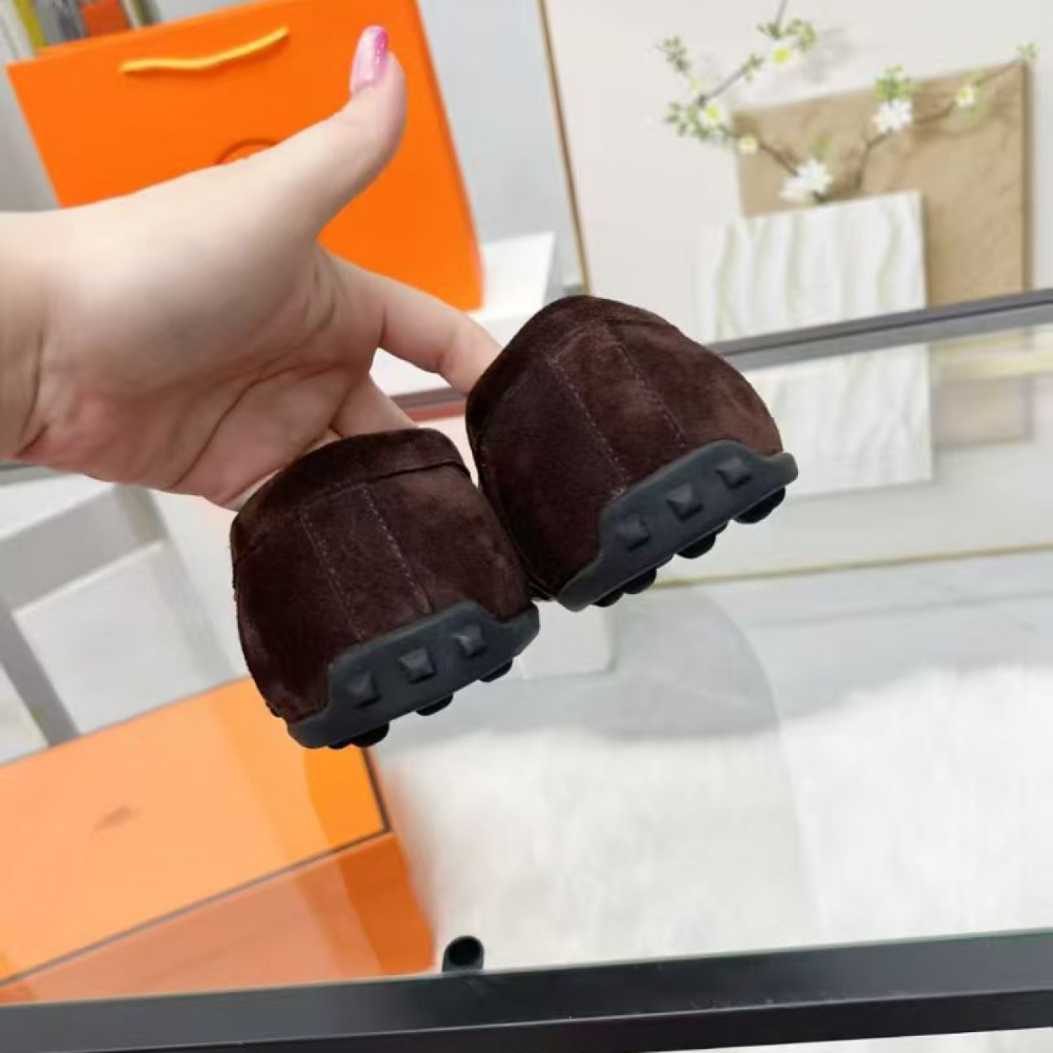 - Лоферы из замши и телячьей кожи с культовым вырезом в форме буквы «H», подошва с резиновыми вставками, вдохновленными культовыми шипами «Медор».