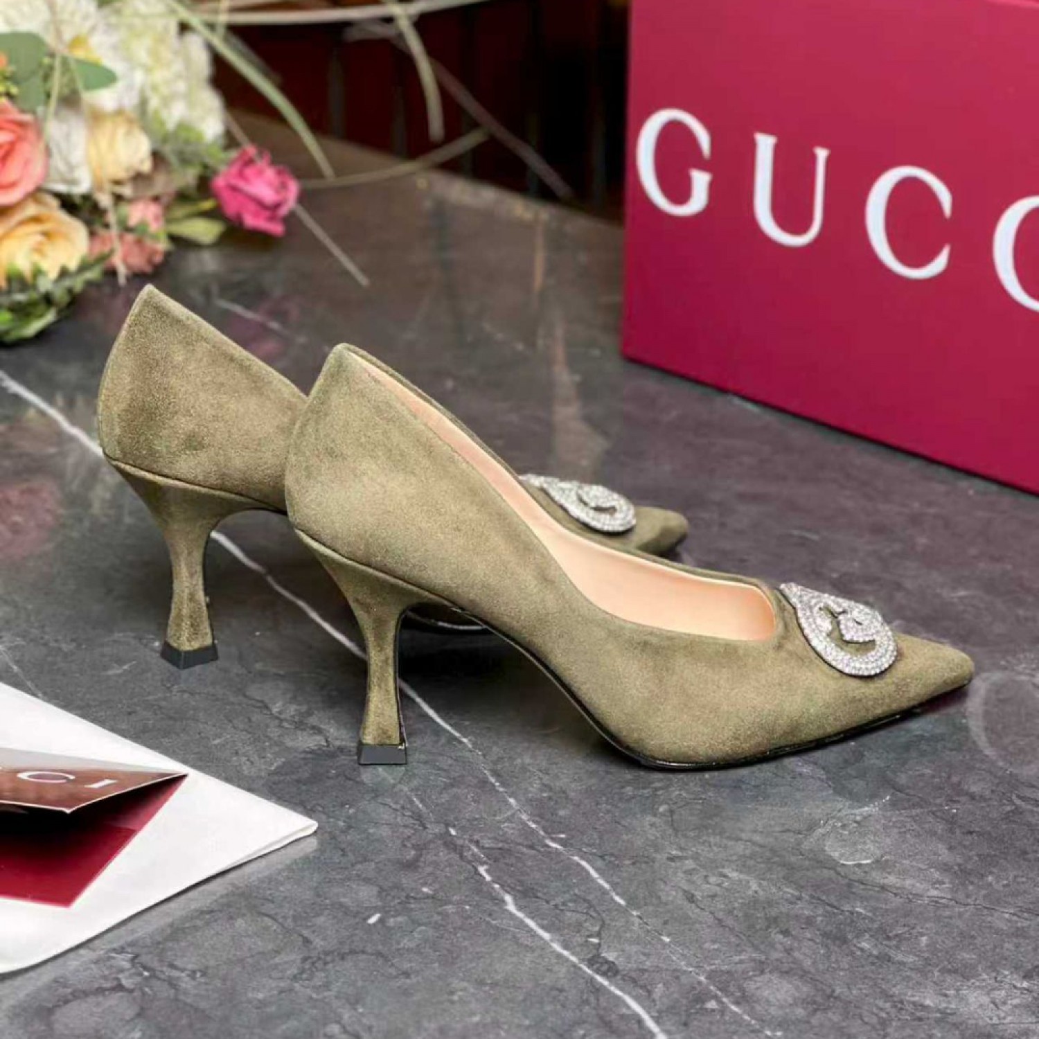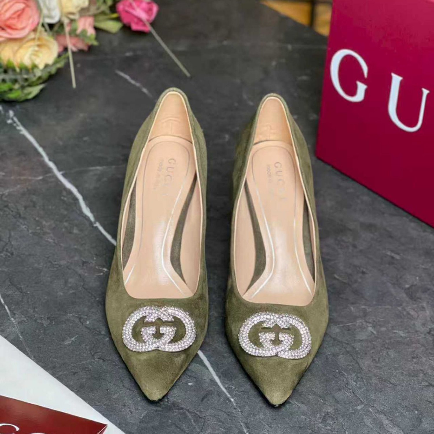 - В последней коллекции женской обуви представлены вечерние модели с фурнитурой Interlocking G, украшенной кристаллами, которая придает замшевым лодочкам сверкающий вид.