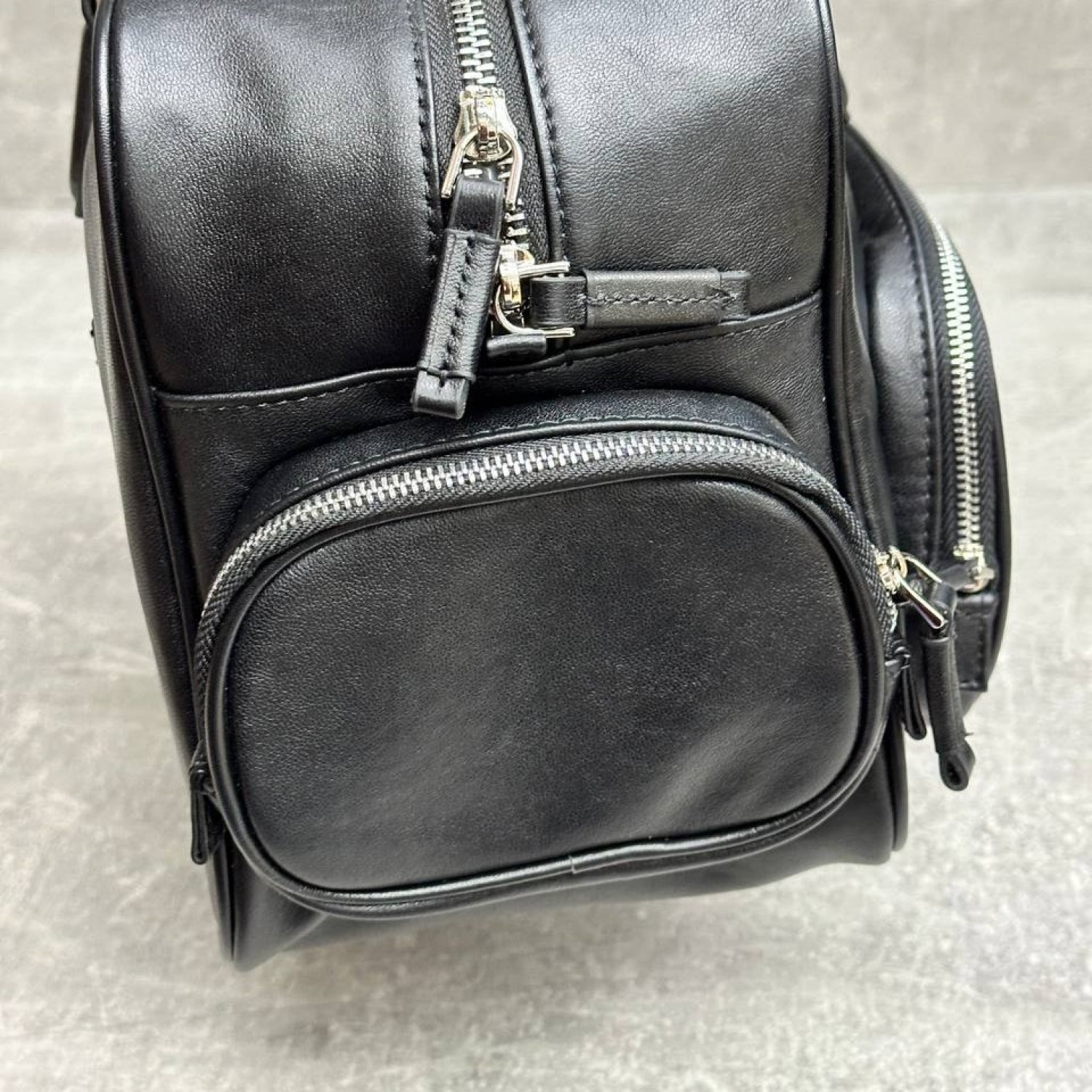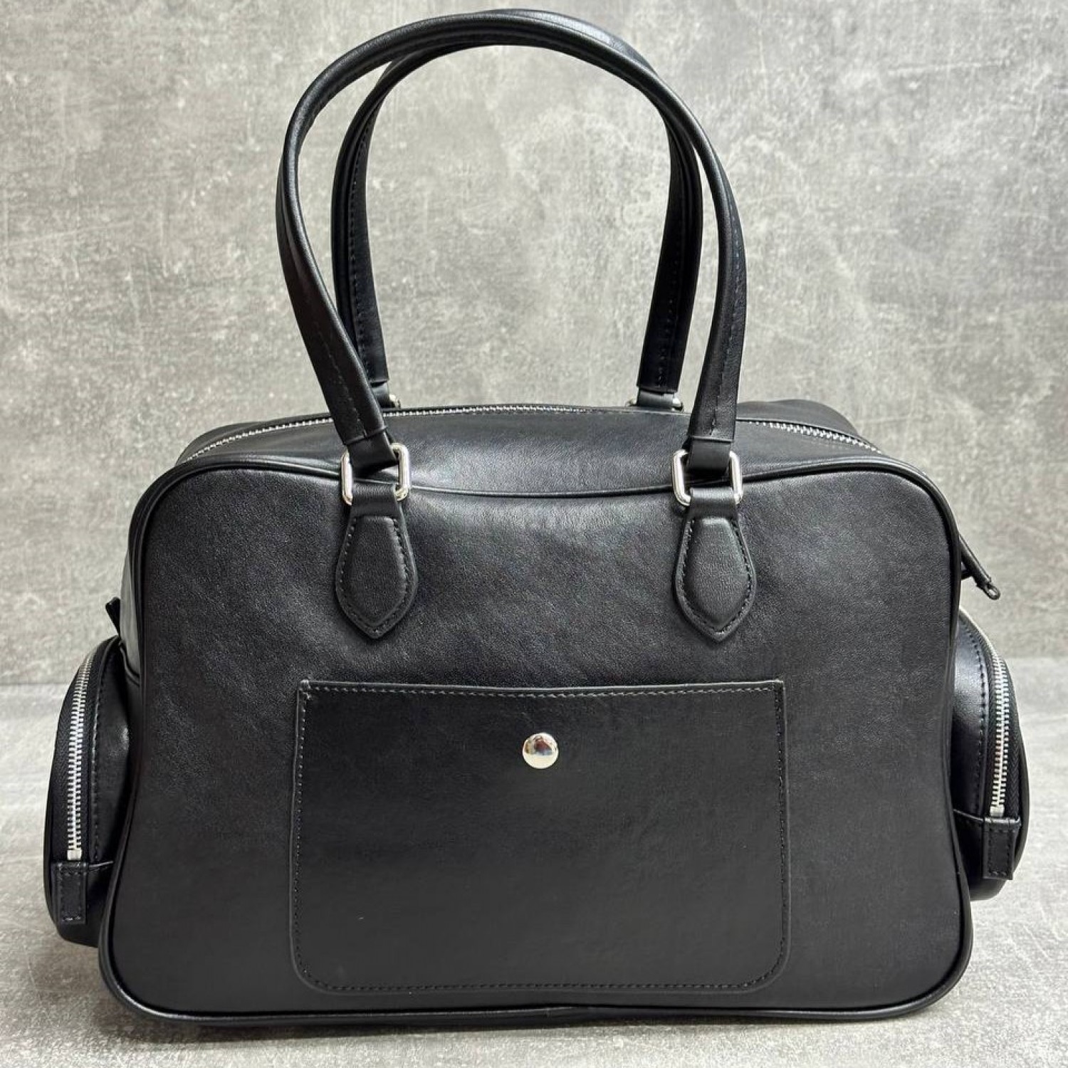 - Модель-тоут из черной нубуковой кожи с тиснением логотипа спереди